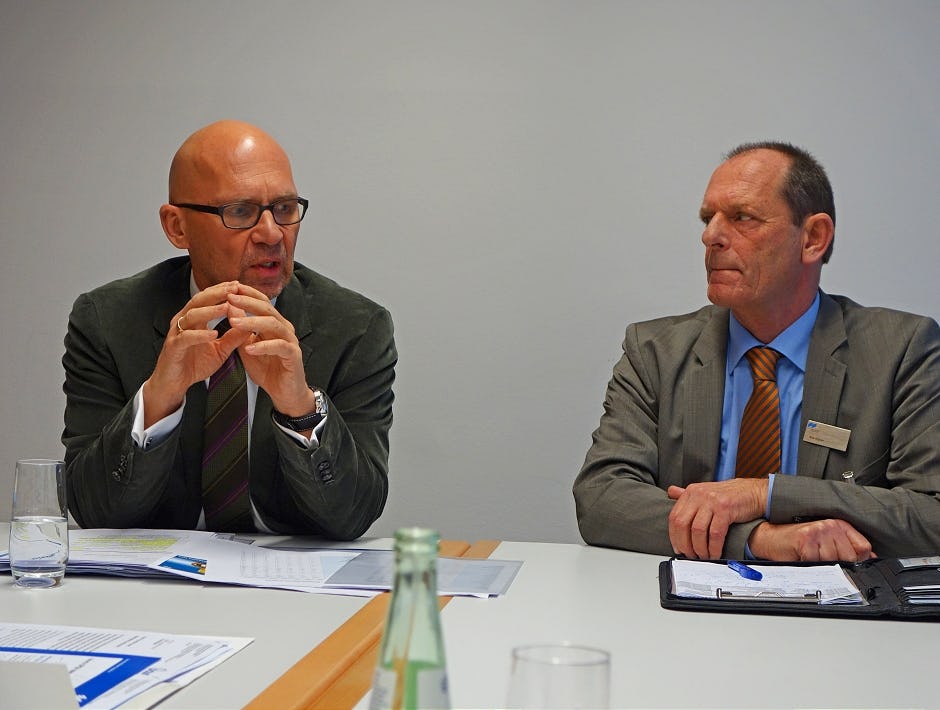 Op de foto links: Klaus Dittrich, topman Messe München. Rechts Bob Krijnen van Ekeris Expo Service uit Haarlem, het bureau dat de Messe in de Benelux vertegenwoordigt.