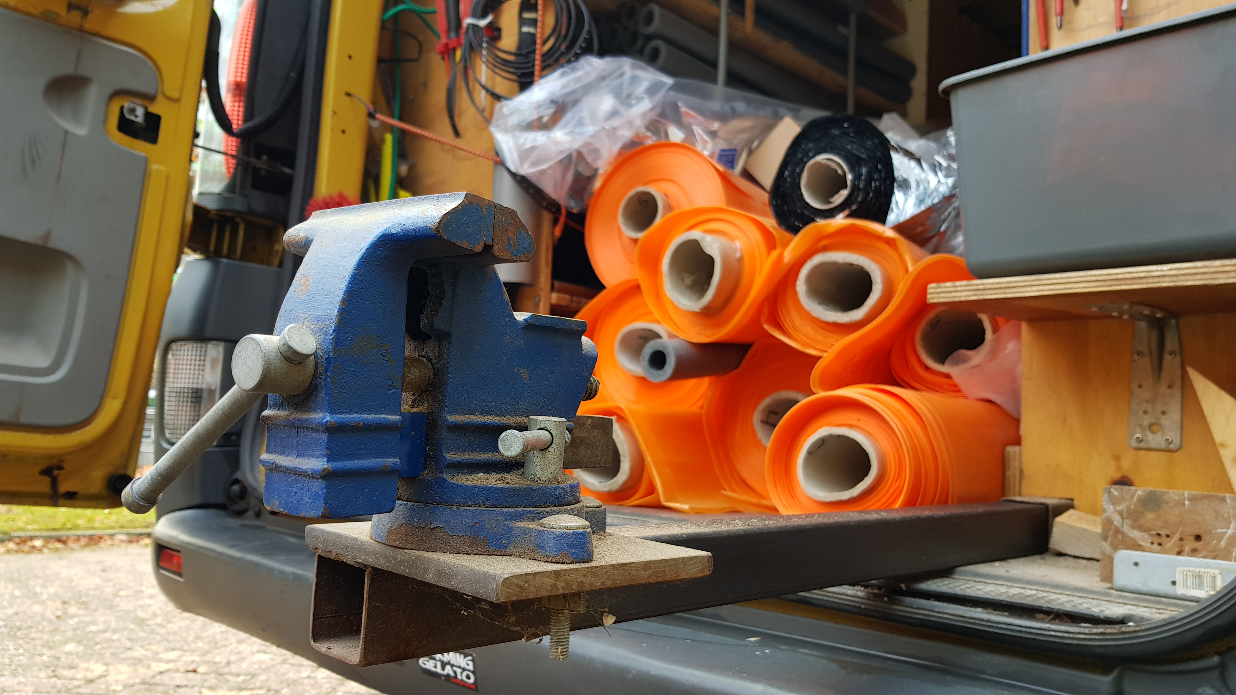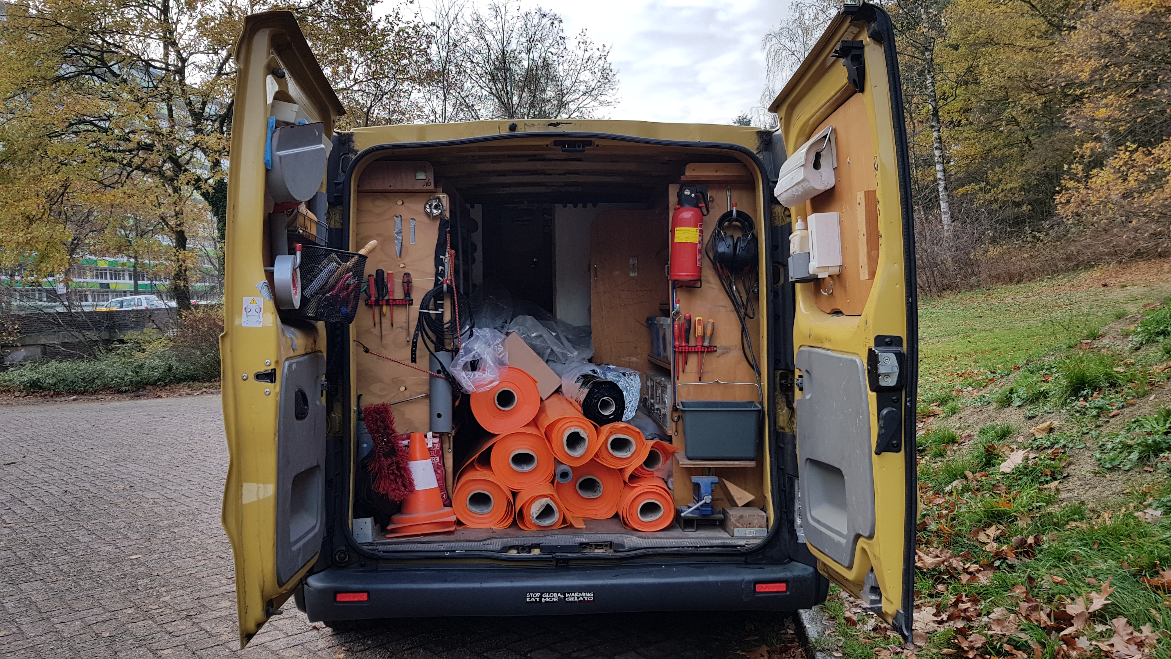 “Het is een verlengde bouwbus met aan beide kanten een schuifdeur. De laadruimte heb ik zelf ontworpen en gebouwd. Perfectionistisch als ik ben, heb ik nauwkeurig uitgerekend hoe al mijn gereedschap, trap en andere attributen het slimst in de bus mee kunnen. Daarbij heb ik de kunst een beetje afgekeken van de wegenwacht. Zo heb ik een uitschuifbare bankschroef en een pvc-pijp in een verloren hoek voor mijn bezem. Bij de kringloop heb ik ladeblokken van een bureau gevonden die nu dienstdoen als opbergruimte voor mijn elektronische apparatuur en wat los bouwmateriaal.”