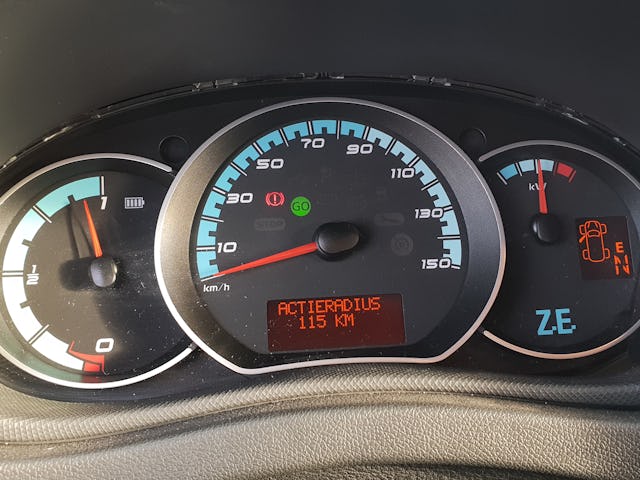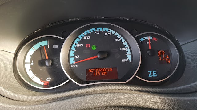 Na het omdraaien van de contactsleutel geeft de display onderin de snelheidsmeter de actieradius aan. Deze wijst op 115 kilometer bij een volle batterij en dat lijkt realistisch. Nu is het een kwestie van de D-stand opzoeken en gas geven, of moeten we zeggen stroom geven?