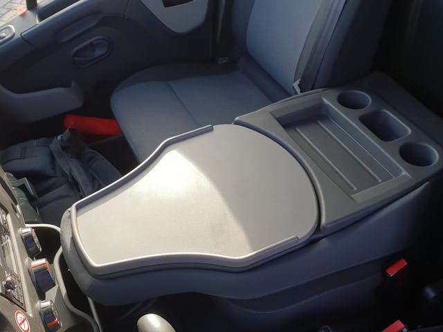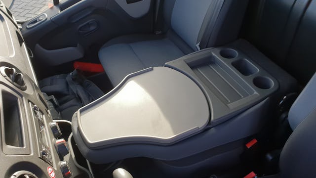 In dit geval beschikt de Master Z.E. over een tweepersoons bijrijdersbank waarvan de linker rugleuning eenvoudig kan worden neergeklapt tot een werkblad om bijvoorbeeld een laptop op te plaatsen. Dit werkblad kan in een hoek worden verdraaid.