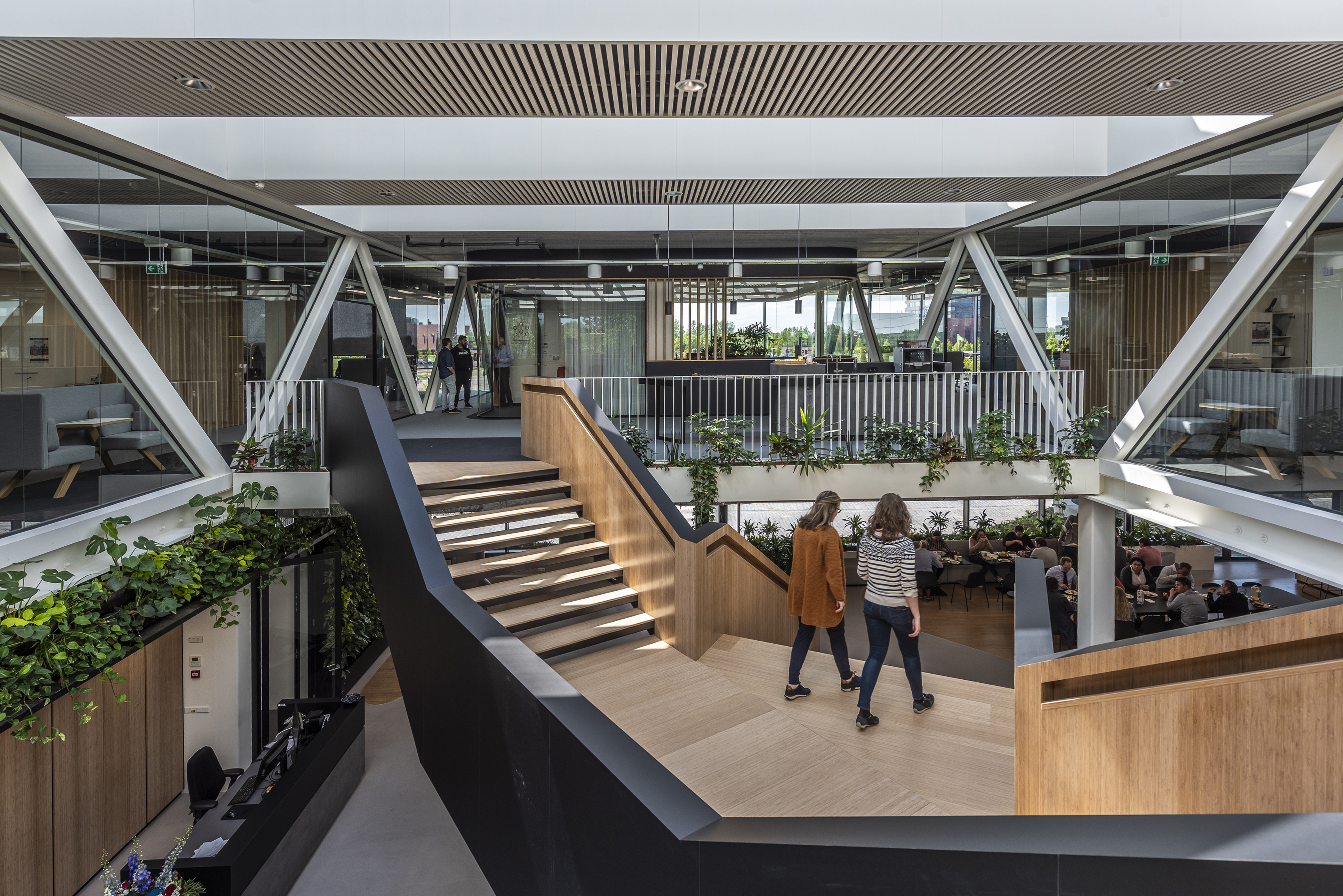 Well-being van de medewerkers staat centraal, daarom is er veel glas voor het licht en zijn er veel planten voor het groen. Het is er prettig werken. Maar uiteraard heeft ook duurzaamheid een prominente plek gekregen. Bakker somt op: ‘Het gebouw is gasloos, we hebben een warmtepomp en op het dak liggen 272 zonnepanelen. Zelfs op warme zomerdagen, waarbij veel koeling nodig is, hoeven we nog altijd geen energie te onttrekken aan het net.’ Daarnaast maakt BESIX gebruik van een accu. ‘Ons gebouw is een smart building. We kunnen leren van en experimenteren met allerlei innovaties. Die accu is er een van. Deze kan energie opslaan en waar nodig, bijvoorbeeld wanneer de sensoren in ons gebouw registreren dat er warmer weer op komst is, terugleveren om het gebouw te koelen.’