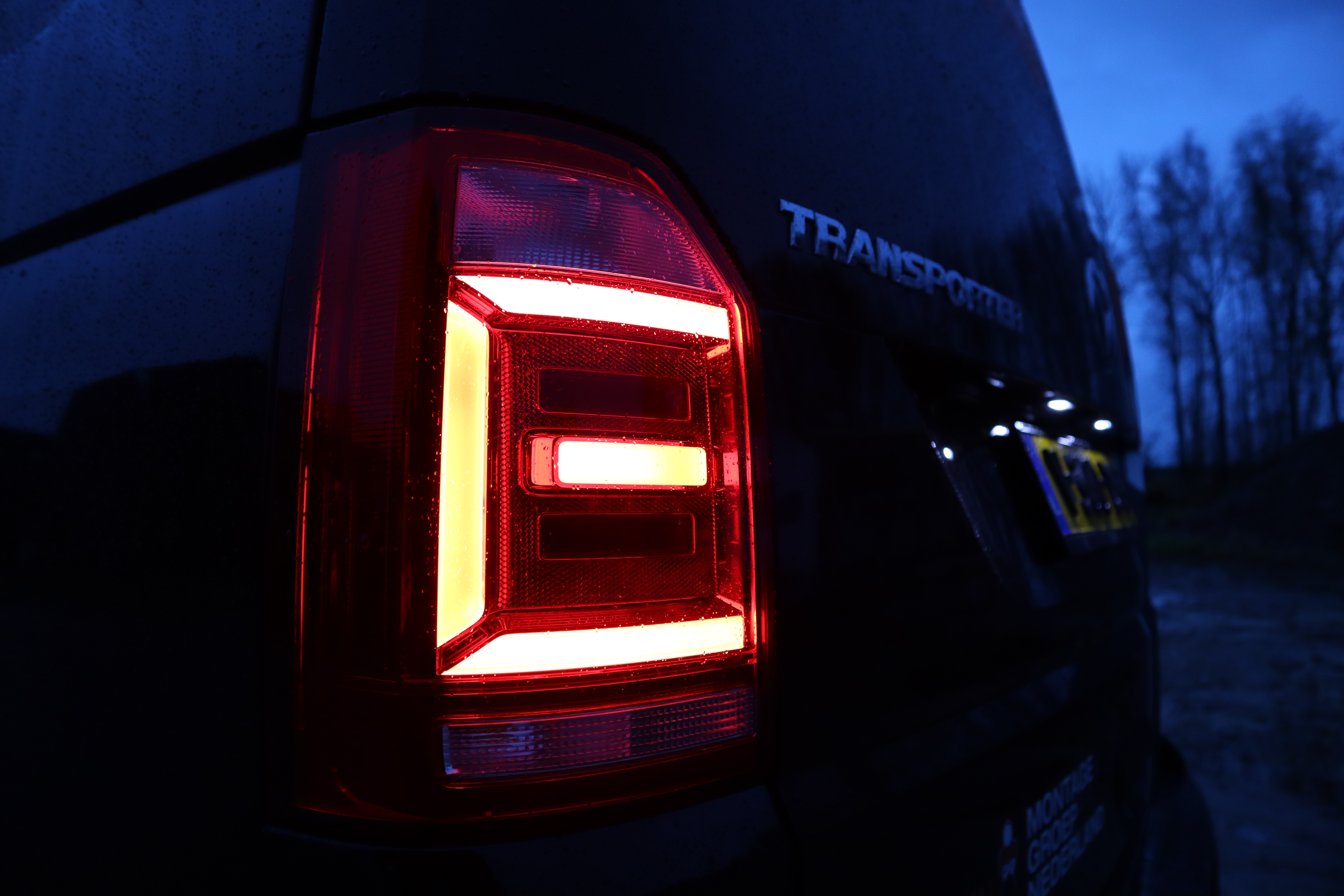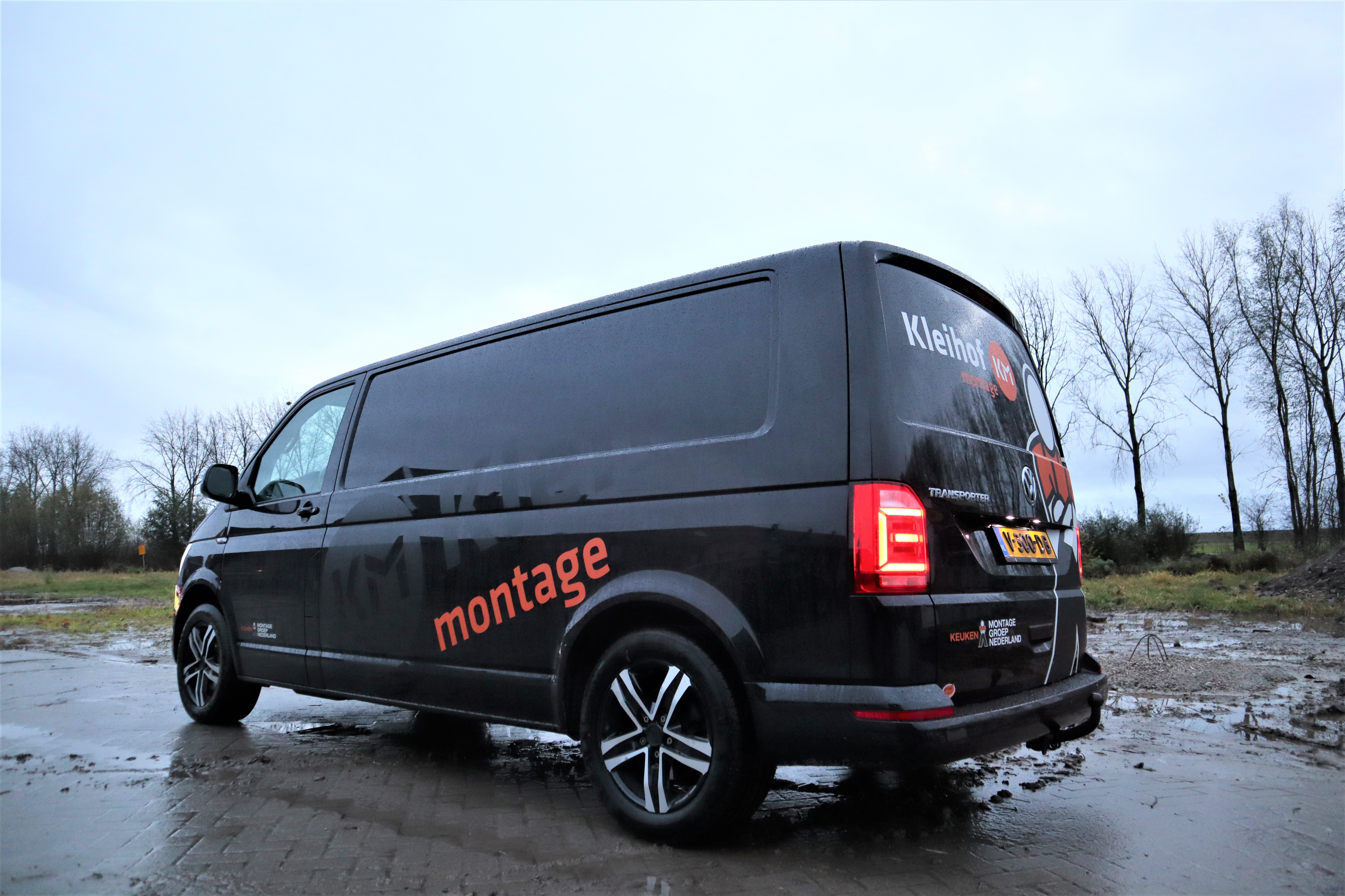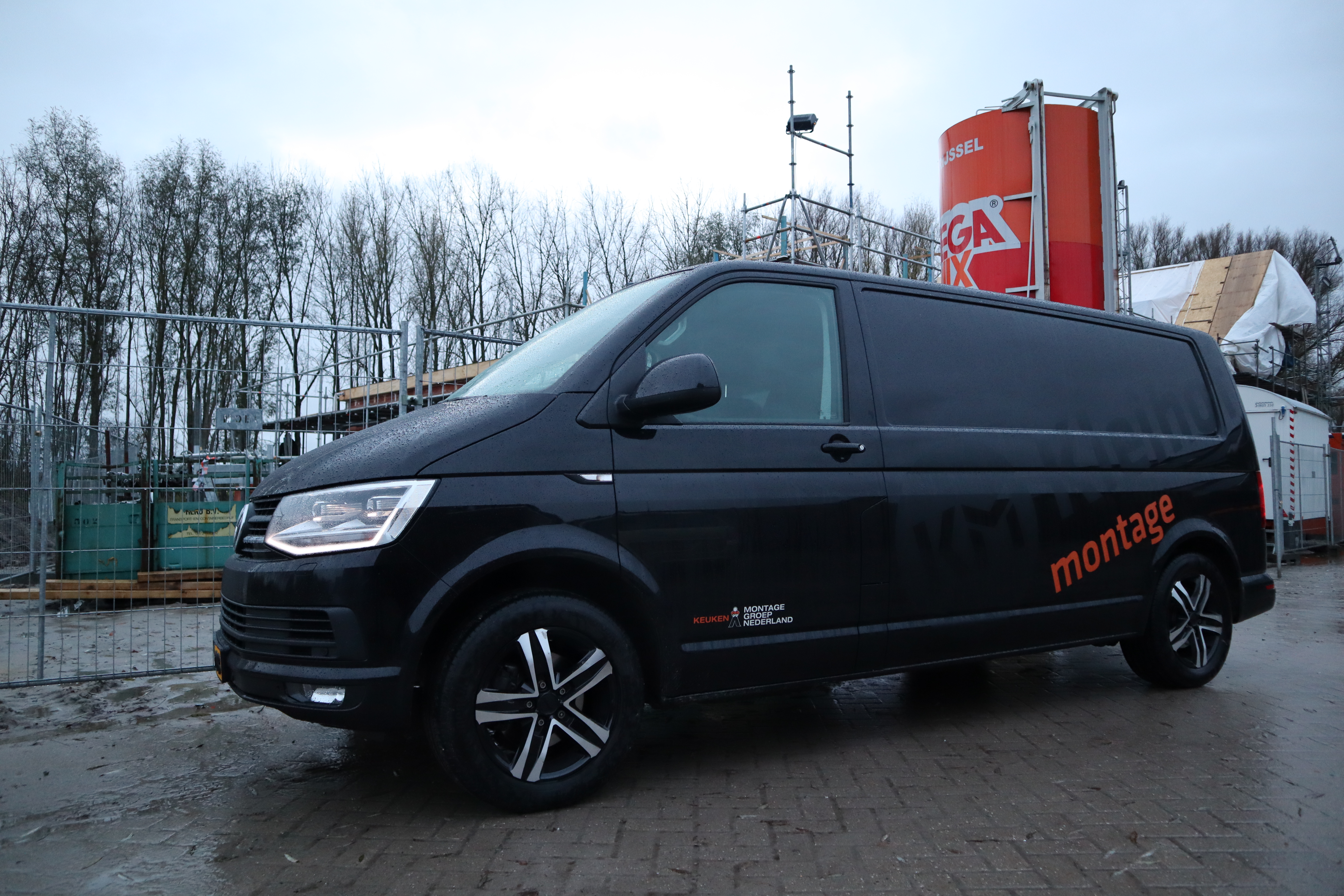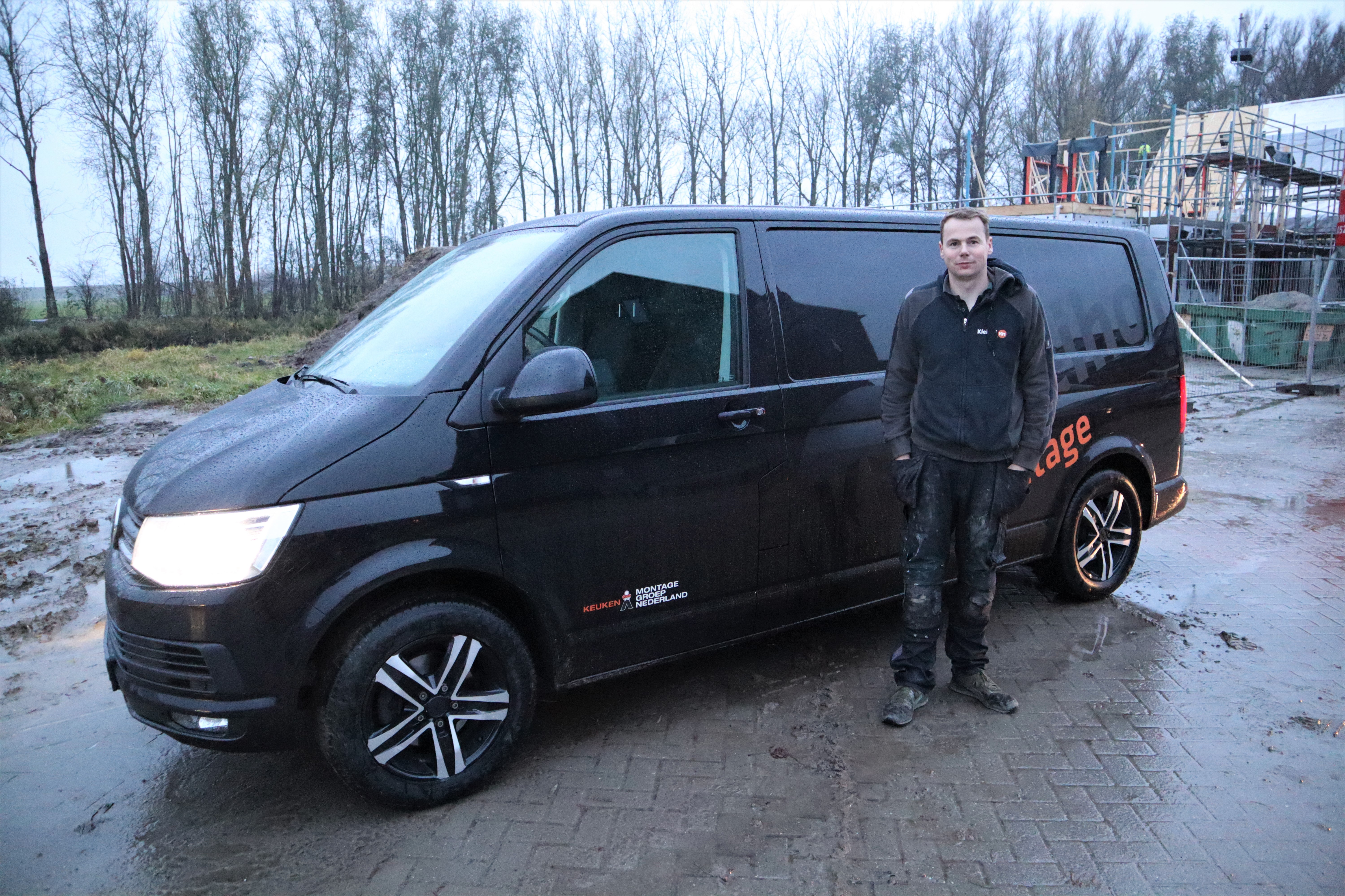 “Mijn Transporter is hoogglans zwart, met matzwarte en oranje bestickering op de flanken. Die matte letters zie je vooral goed bij een bepaalde lichtinval. Ik vind dat chique en stoer. Op de achterkant zit een afbeelding van een ‘poppetje’; het logo van Keuken Montage Groep Nederland.