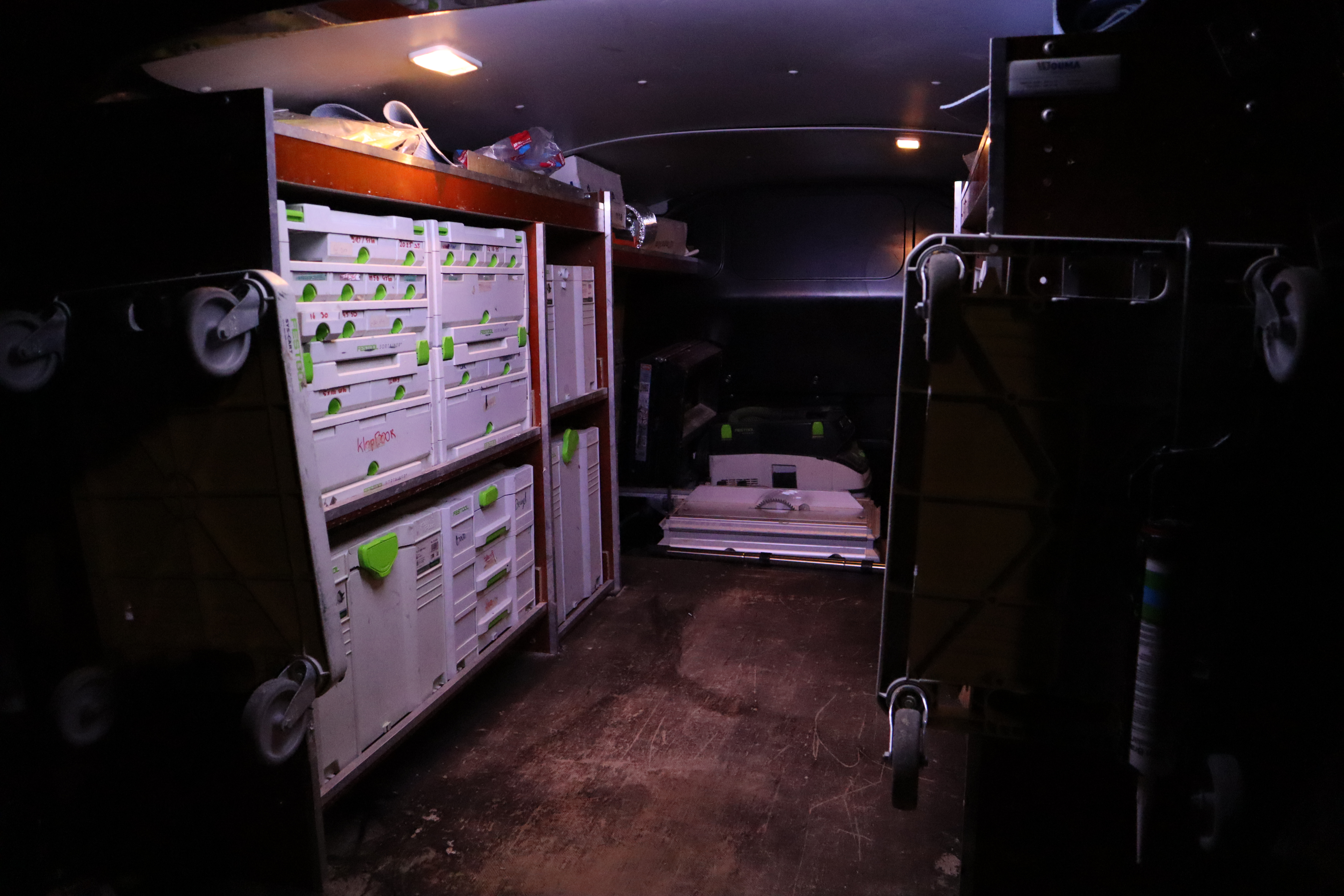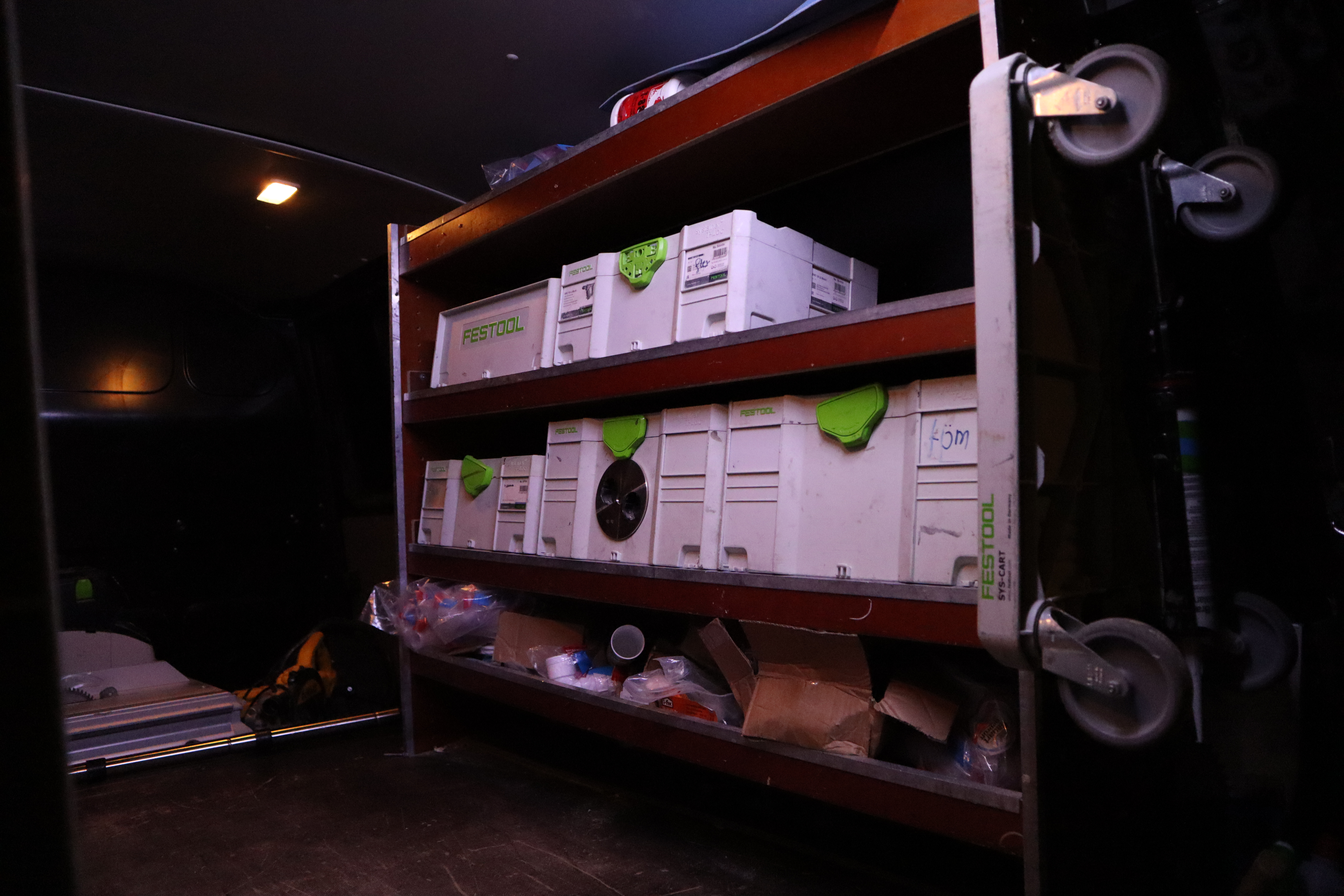 “Door te kiezen voor een klep in plaats van openslaande achterdeuren sta ik nu droog en heb ik de ruimte om langs beide kanten met mijn spullen te lopen. Ook heb ik goede verlichting in de laadruimte. In de bus waarmee ik het ongeval heb gehad, had ik een stalen indeling met schappen. Daar ben ik van teruggekomen, want met het ongeval staken de stukken staal dwars door de cabine. Dus dat nooit meer. Aluminium was een optie, alleen prijstechnisch kon ik mij dat niet veroorloven. Uiteindelijk kwam ik bij een bedrijfswageninrichter die deze inrichting van multiplex op maat heeft gemaakt, destijds nog voor de dubbele cabine. Door de bakken is alles makkelijk terug te vinden en wordt voorkomen dat de spullen los in de laadruimte liggen. Ik heb eerst nog overwogen om de verhoogde vloer door te laten lopen, maar heb toch bewust ruimte aan de kop gelaten voor grotere machines, gereedschap en materialen. Onder de verhoogde vloer zijn twee lange lades geplaatst en heb ik ruimte voor lang materiaal. Ik heb flink wat laadvermogen en mag ook behoorlijk wat achter hangen. Dat benut ik dan ook optimaal, want ik rijd regelmatig met een volle aanhanger.”