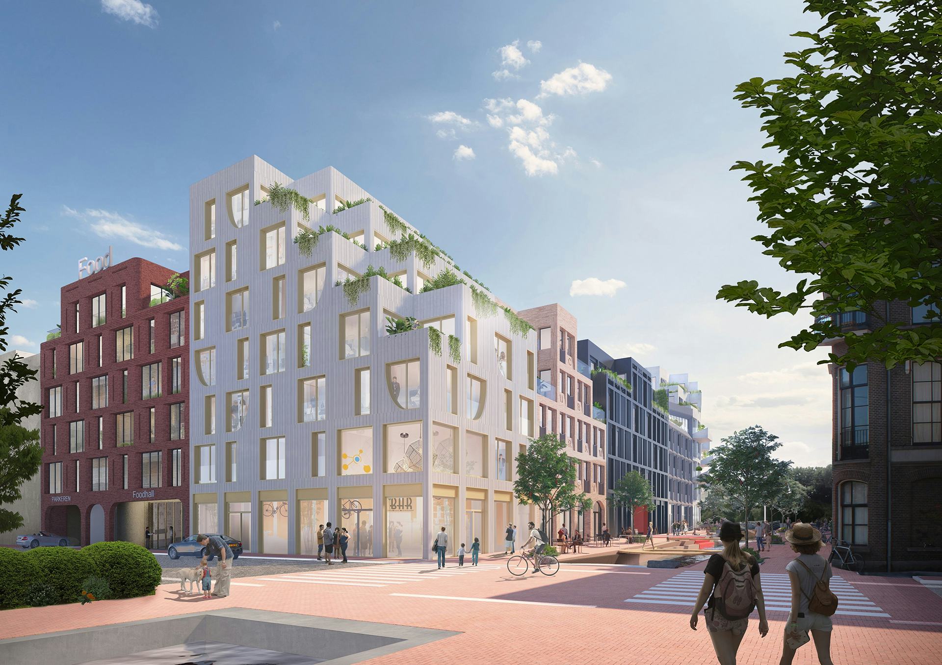 De gebouwen bestaan uit bruisende arcades waar onder meer gewerkt en gewoond wordt, met groene daken en grote terrassen die nadrukkelijk zichtbaar zijn in het straatbeeld.