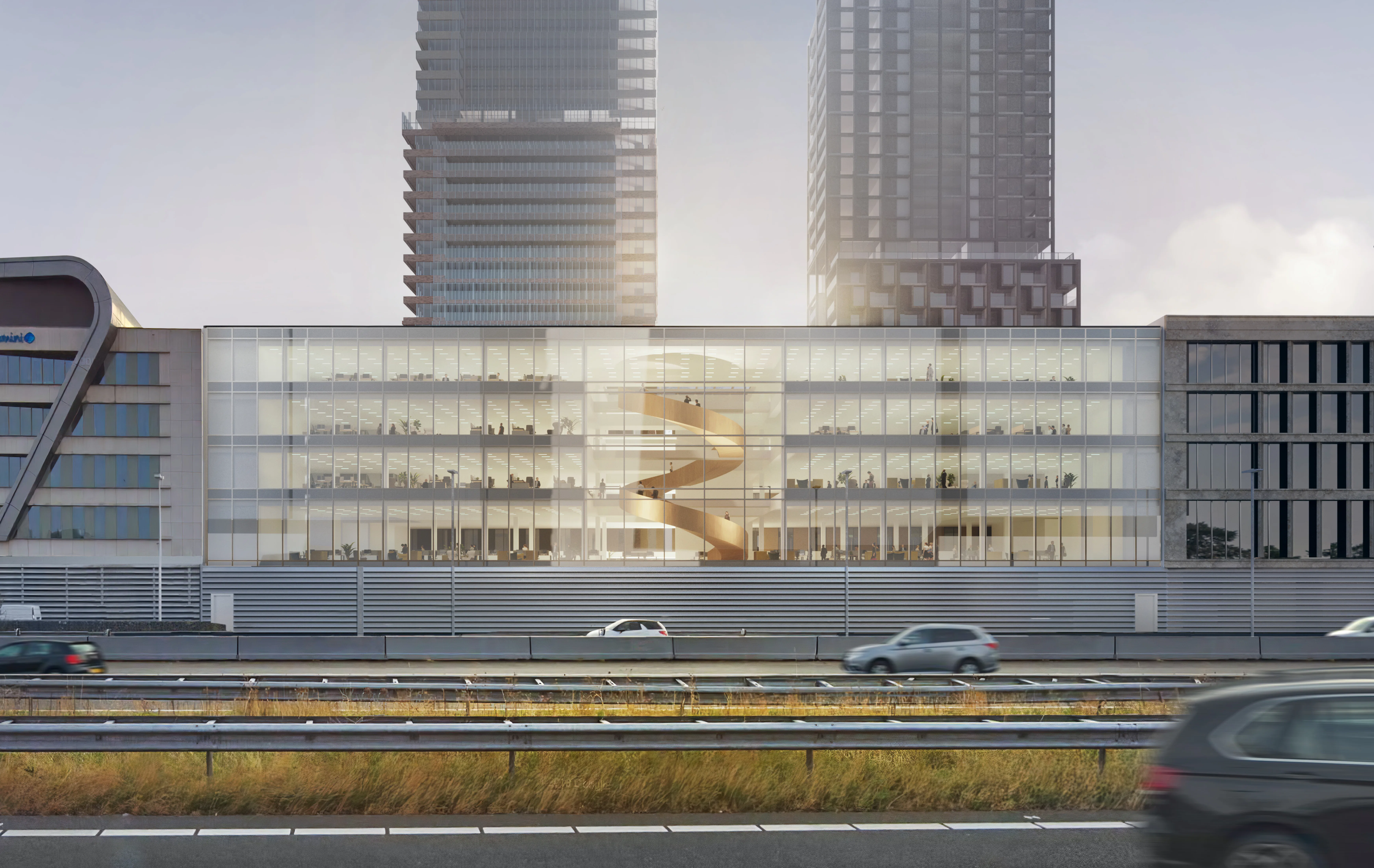 "Beweging stimuleren en gezond werken, dat is het idee achter deze trap. Die nodigt uit tot bewegen, maar het wordt ook echt een heel cool ding. De trap is van staal en wordt ’s avonds aangelicht, zodat hij zichtbaar is voor iedereen die over de snelweg rijdt.’’