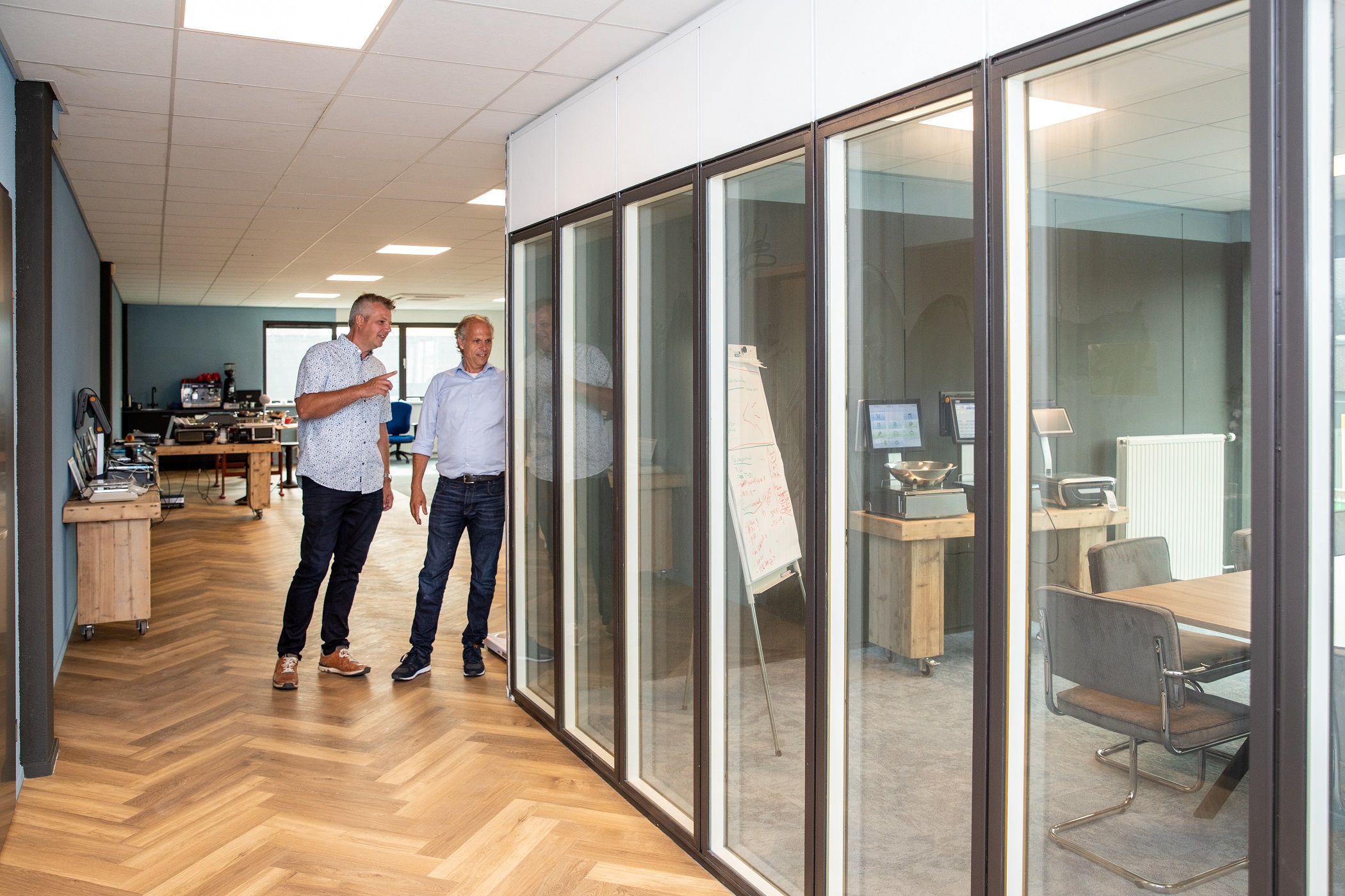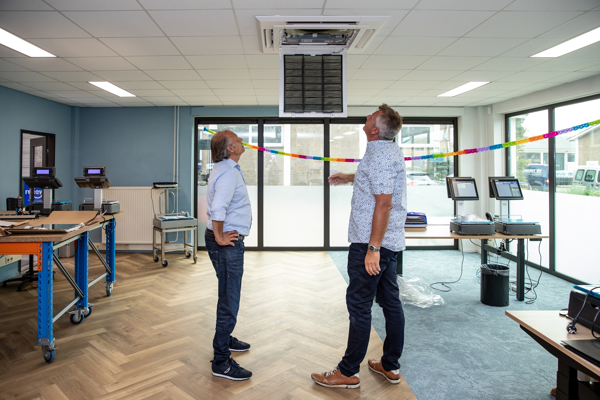 “Ons gebouw stamt uit de jaren negentig”, vertelt Weda-directeur Rutger Gassner. “We hadden kleine kantoren aan een lange gang. Dat sloot niet meer aan bij onze wensen. Daarom hebben we er open ruimten van gemaakt: er zijn 16 muren verwijderd.” Installateur Thermgroep zorgde voor het installatiewerk. Directeur Vincent van Heijst legt uit dat er is gekeken of het ontwerp van de klimaatinstallatie moest worden aangepast: “Het bleek dat die in de basis gelijk kon blijven. Er is nu een verdeling over drie zones: beneden, een grote ruimte boven en het kantoor.”
