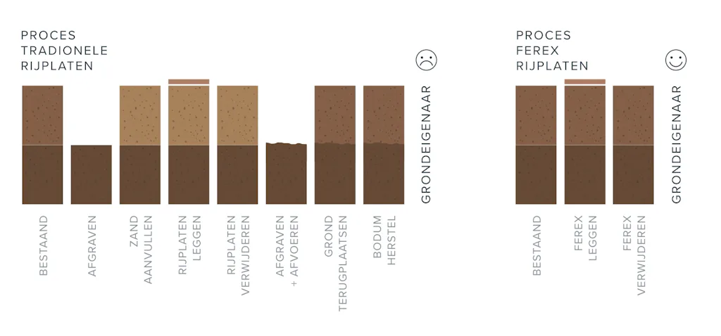 Bij het plaatsen van de Ferex-rijplaten kunnen veel van de gebruikelijke werkzaamheden achterwege blijven: te denken valt aan het uitrijden en afvoeren van de stalen rijplaten/drag- lineschotten en het tussentijds onderhouden van de rijbaan. Hierdoor is minder inzet van machines nodig en dat levert een aardige reductie op van de CO₂-uitstoot. Het leggen van de composietplaten kan geheel emissievrij gebeuren door de inzet van elektrisch aangedreven laad- en losmaterieel. Daarmee zijn ze helemaal van deze tijd.