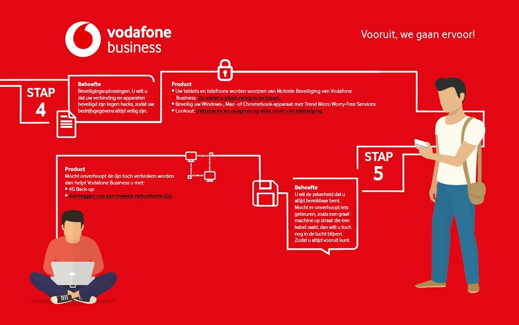 Claudia startte met het uitschrijven van alle processen en wensen en min of meer bij toeval stuitte ze toen op Vodafone Business als partner. “Eigenlijk ging ik voor mezelf naar een Vodafone-winkel. Terloops stelde ik daar de vraag of ze ook wat konden betekenen op zakelijk gebied. Van het een kwam het ander.”