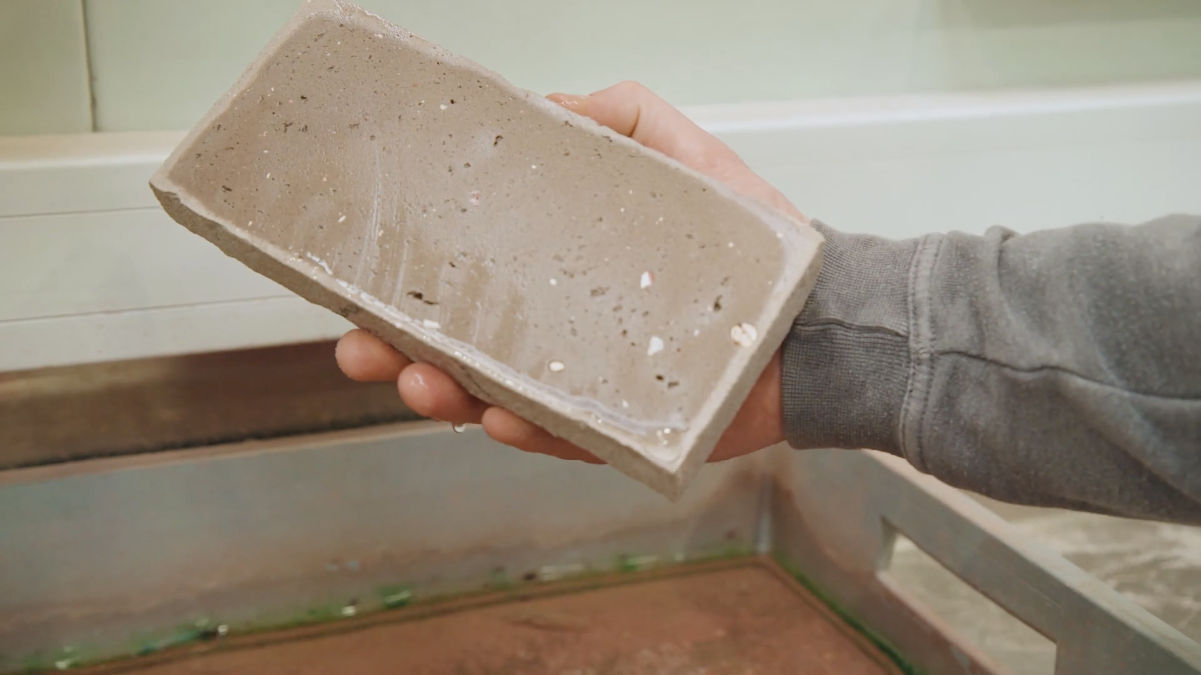 Bij Vandersanden hebben ze fors geïnvesteerd in een oplossing om uitbloei en vergipsing te voorkomen. Dat gebeurt door de net gebakken bakstenen te impregneren in plaats van de hele gevel na het opmetselen te behandelen. Die methode houdt in dat de stenen al in de fabriek voorzien worden van een beschermend milieuvriendelijk middel, wat zorgt voor een gecontroleerder proces dan ter plekke impregneren. “De poriën van geïmpregneerde bakstenen krijgen een beschermlaagje. Daardoor kunnen het water en de mineralen er niet meer doorheen. Je creëert dus eigenlijk een schild waar het water en de mineralen achter blijven zitten”, legt Gelling uit. “Er komt geen impregneermiddel op de legvlakken van de bakstenen, zodat je een goede hechting hebt met de metselmortel.”
