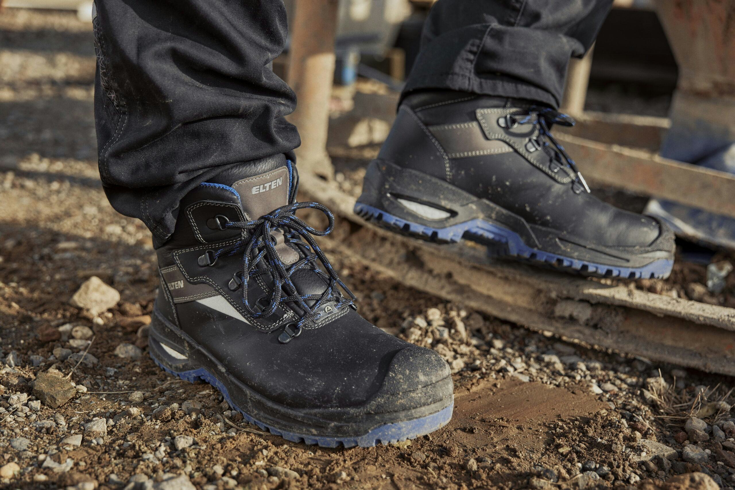 De XXSG-modellen van ELTEN, bijvoorbeeld, zijn uitgerust met dit dempingsconcept. De serie omvat de halfhoge veiligheidsschoenen 'Francesco XXSG black Mid ESD S3' en 'Stefano XXSG black-blue Mid ESD S3'. Deze zijn de ideale metgezel voor de ruige werkomgeving op bouwterreinen. Ze hebben elk een bovenwerk van rundleder en een aangespoten PU kruipneus; het materiaal is slijtvast en zorgt ervoor dat de schoen niet te snel slijt aan de voorkant.