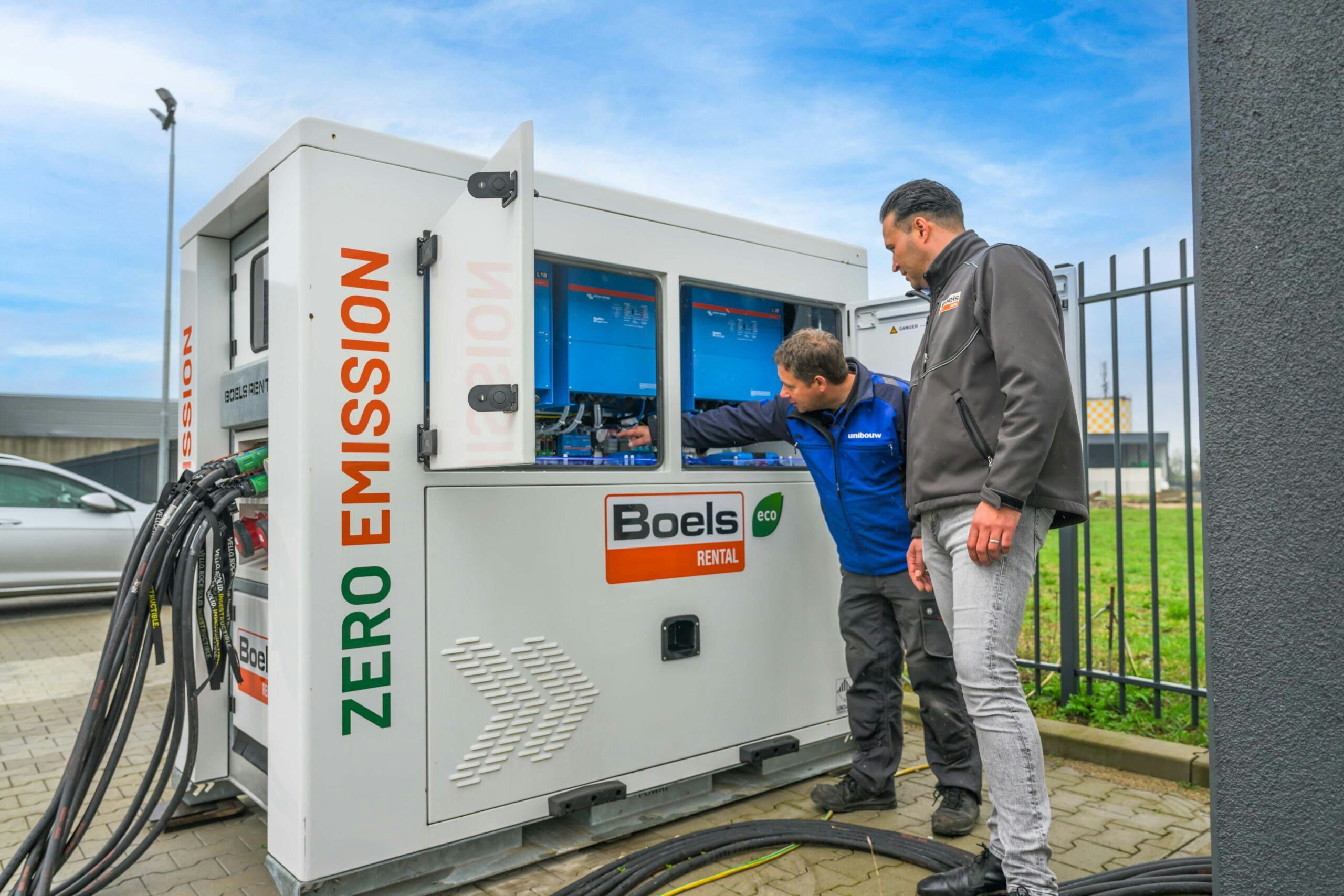 “Boels verhuurt diverse energieopslagsystemen (EOS),” legt Van Beelen uit. “Dit varieert van draagbare accupakketten met een vermogen van 1600 of 2000 watt (voor bijvoorbeeld elektrische handgereedschappen) tot met een vorkheftruck te verplaatsen batterypacks en accucontainers met vermogens van 45 tot maar liefst 318 kVA (bij 400 volt).”