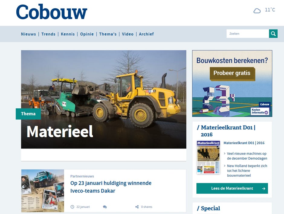De downloadversie is te vinden op de themapagina ‘Materieel’ van de Cobouw-site: http://www.cobouw.nl/thema/1600496-materieel. Wanneer u in de rechterkolom klikt op de verkleinde cover van de Materieelkrant wordt de bladerversie automatische gedownload en geopend.