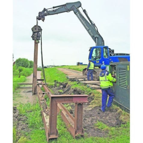 Beugel Infrastructuur uit Beilen heeft de eerste stalen damwanden geslagen om de dijk langs het Eemskanaal in Groningen aardbevingsbestendig te maken.
