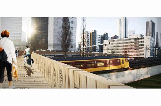 De luchtsingel in het Rotterdamse stationsgebied maakt dit jaar de sprong over het spoor. De houten brugconstructie verbindt straks het Centraal District met Hofbogen, Pompenburg en Delftsepoort. Vorig jaar werd al een loopbrug over de Schiekade gebouwd. Vanaf juni volgt verlenging naar het historische spoorviaduct 'Hofbogen' en naar het Pompenburg, waar ook een 'culinair stadspark'