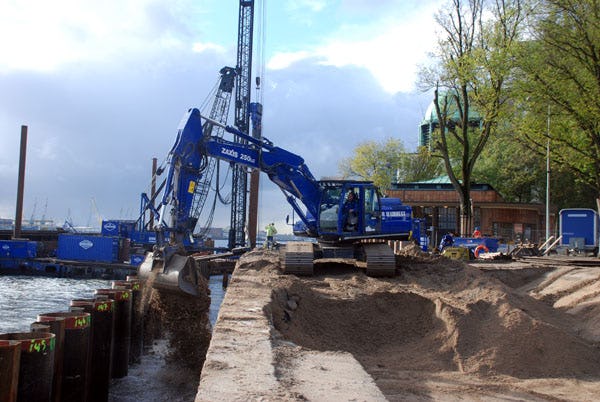 Pal naast de monumentale roltrappen- en ventilatorgebouwen van de Maastunnel bouwt aannemerscombinatie BaKo een nieuwe kadeconstructie. Een secuur werk, want bij zetting lopen de historische houten roltrappen vast. ''Eén millimeter zetting is al te veel'', laat projectcoördinator Marc van Leeuwen weten. Van onze correspondent