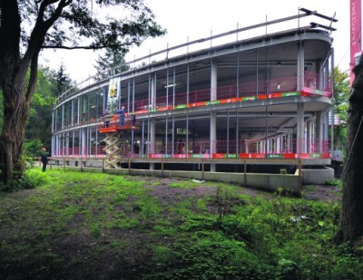 In de bossen bij Bilthoven is hoofdaannemer BAM Utiliteitsbouw begonnen met de montage van de glazen puien van het Helen Dowling Instituut.