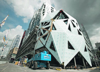 Geen rechte hoek te vinden in de gevel van de nieuwe Pauluskerk in Rotterdam. Sorba Projects bouwt het grillig gevormde godshuis uit zo'n zestig unieke elementen met koperen felsbeplating. Vooral het waterdicht krijgen van de gevel is een uitdaging.