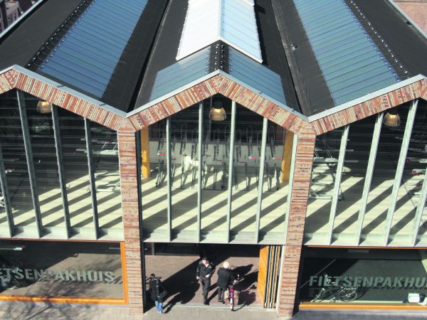 Het Fietsenpakhuis van Zaanstad is voorzien van een nieuw type zonnecel dat speciaal voor lichtgewicht daken is ontworpen.