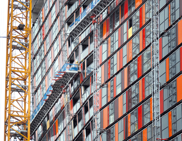 De entree van Rotterdam nabij het Centraal Station verschiet momenteel van kleur, want de gevelafwerking van gebouw Calypso is in volle gang.