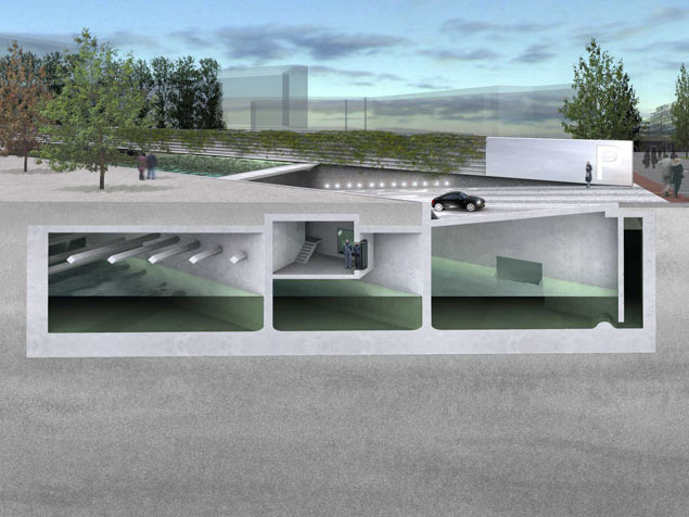 Het gewelf onder de inrit van de pas geopende garage heeft de omvang en akoestiek van een kathedraal. Eentje met een paar machtige zijbeuken: het bassin van 60 bij 35 meter is gecompartimenteerd door zware constructieve wanden in lengterichting.
