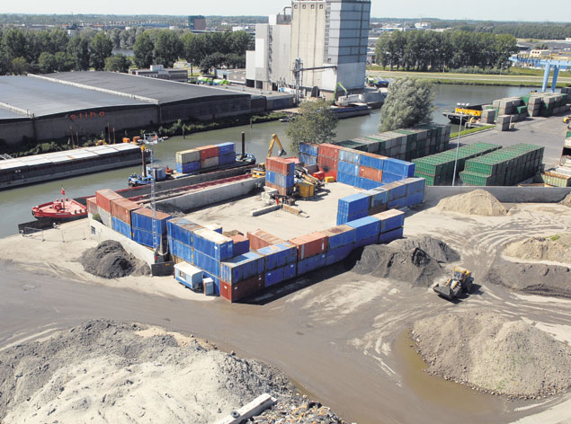 Muren van containers vormen een beschermingswal tegen mogelijk ontploffingsgevaar bij een baggerwerk op industrieterrein Lage Weide in Utrecht.