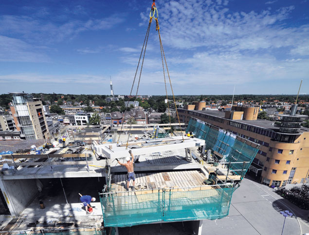 Op de hoek van de Amsterdamseweg en de Bovenbrugsestraat in Arnhem speelde zaterdag en waar kranenballet. Een 80 meter hoge mobiele kraan hees een torenkraan uit het hart van het nieuwe hoofdkantoor van Cito dat Schutte Bouw & Ontwikkeling hier bouwt.