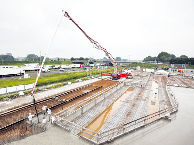BAM Civiel en zijn onderaannemers gebruiken op de nieuwe RET tramremise in Rotterdam Europa's grootste betonpomp. Een uitkomst voor de stortploeg, want die hoeft niet meer met loodzware slangen te sjouwen.