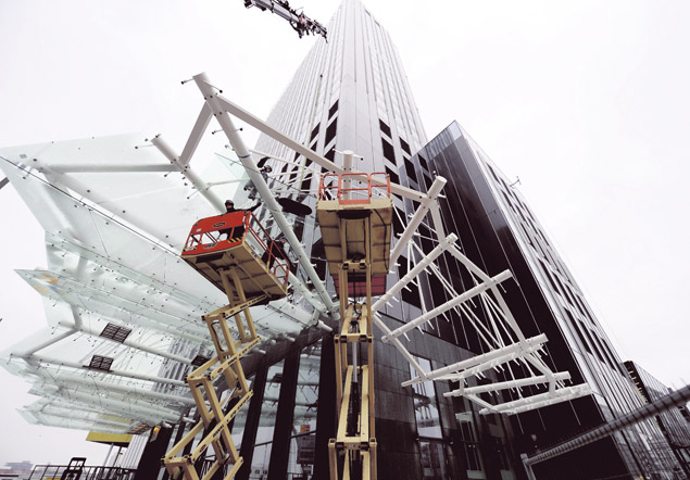 Werknemers van Saint Gobain Glass Solutions plaatsen de laatste delen van de glazen luifel van Nederlands hoogste kantoorgebouw De Maastoren in Rotterdam.
