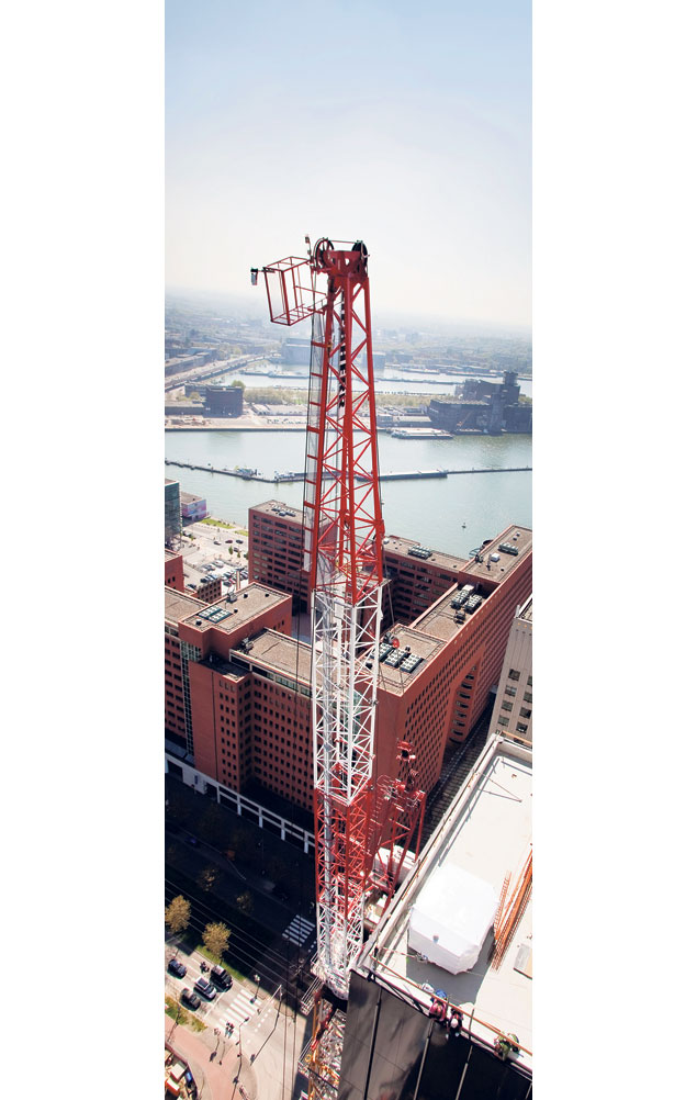 De bouwers van de Maastoren aan de Rotterdamse Koningshaven konden na een ongekende groeispurt deze week de eerste van de drie enorme Liebherr topkranen alweer afbreken.