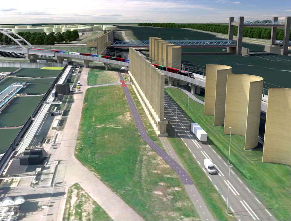 De trein moet straks dwars door 's werelds grootste windscherm en daarom is het een bouwdrukte van jewelste aan het Hartelkanaal. Drie megabetonplaten gaan tegen de vlakte, een nieuw scherm vult het gat. In oude stijl, dat wel.