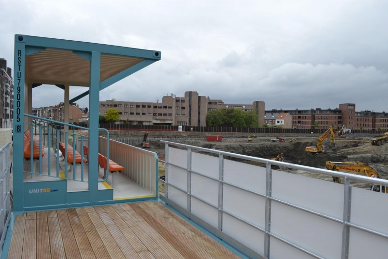 De bouwplaats van de nieuwe stadswijk Quartier Bleu in het Belgische Hasselt heeft een primeur: een overdekte bouwplaatstribune. De oranje kuipstoeltjes zijn reuze handig voor bouwplaatstoeristen en houden de buurt tevreden, vertelt Dirk Houben van bedenker Impuls Communicatie.