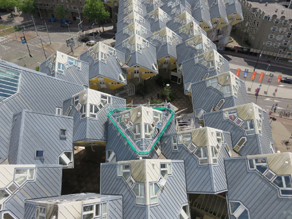 Onderhoud aan kubuswoningen is een ingewikkelde puzzel, want hoe werk je tegen die schuine gevelvlakken? Op het Blaakse Bos gebeurt het met een driehoekige prefab omloopsteiger, die in één keer op de punt van het dak wordt gezet.