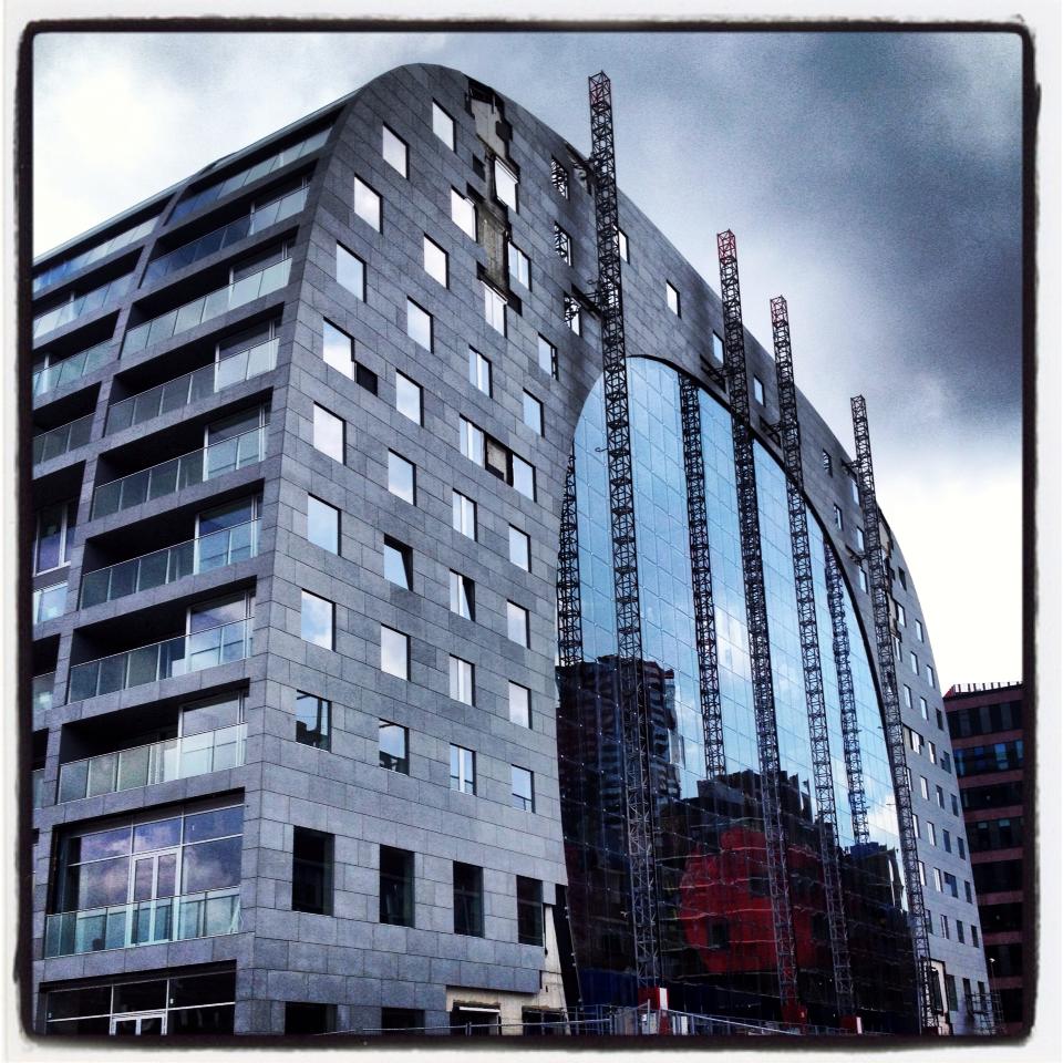 Vanuit de glazenwassersbak aan de top van de boog ziet de marktvloer er enigszins chaotisch uit. Toch werken de door elkaar krioelende timmerlieden, tegelaars en installateurs volgens een systematiek. Anders bouwen ze zichzelf en elkaar vast.