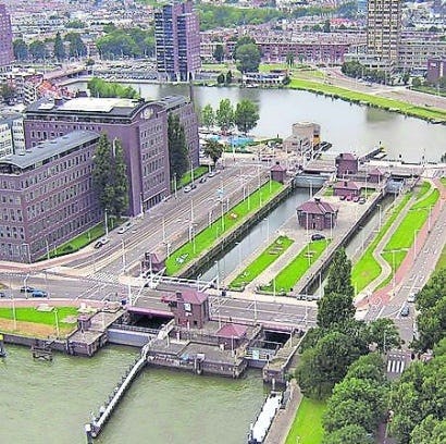 Na drie weken van stremmingen zou eindelijk de nieuwe buitendeur van de Parksluizen in Rotterdam worden geplaatst. Maar de operatie waarbij de deur met zwaar materieel werd ingehesen, liep anders dan gepland: de deur paste niet. Even bijschaven was geen optie, vertelt woordvoerder Pascal Hofmann (Stadsbeheer).
