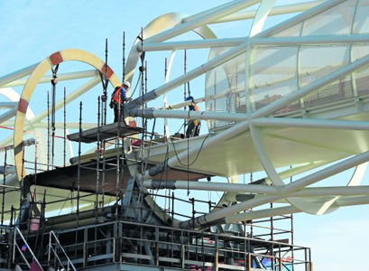 Nog even afbouten en -lassen en dan is de 'vliegende netkous' in Rotterdam compleet. De 200 meter lange stalen fietsbrug arriveerde afgelopen weekend in het holst van de nacht op locatie.