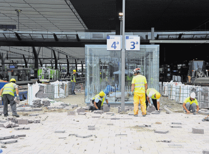 Het nieuwe station Rotterdam Centraal kleurt momenteel langzaam rood. Hoofdaannemer Mobilis voorziet alle dertien perrons van een natuurstenen vloer van dieprood Chinees porfier.