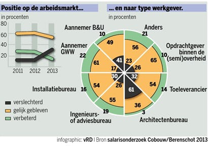 Uit het jaarlijkse salarisonderzoek van Cobouw en Berenschot blijkt dat 20 procent van de respondenten verslechtering van hun positie op de arbeidsmarkt vreest.