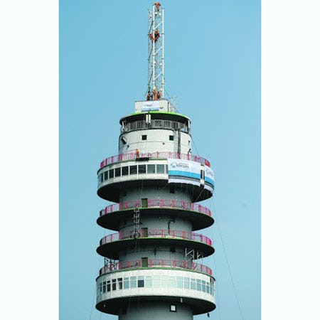 Volker Wessels Telecom is begonnen met de montage van de nieuwe zendmast op de herstelde toren in Hoogersmilde. Op de grond liggen 12 stalen tuidraden gereed voor de stabiliteit.