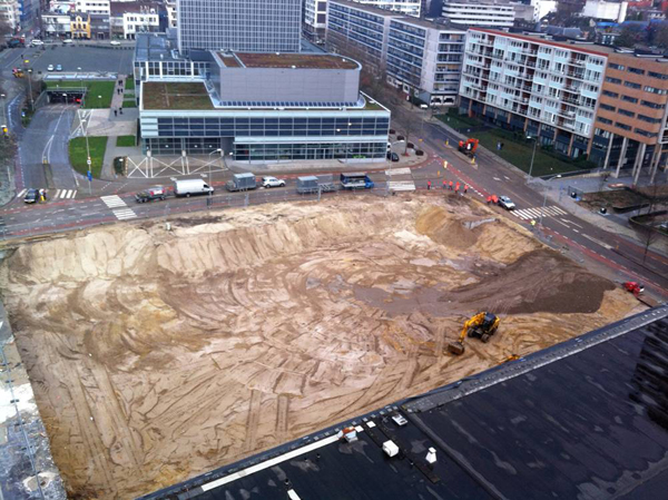 Bouwbedrijf Van Grunsven uit Erp zal de schade aan het gebouw Den Hertogh in Breda herstellen. Het plafond onder het overstek bij de entree kwam donderdag volledig naar beneden.