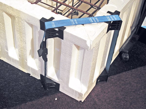 De Hoop Pekso heeft hoekverbinders toegevoegd aan de Topkist-funderingsbekisting van geëxpandeerd polystyreen (eps). De verbinders houden tijdens het betonstorten de bekistingselementen bij elkaar.