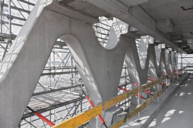 De Prosta Tower, een 70 meter hoog kantoorgebouw in de hoofdstad van Polen, heeft een dragende in het werk gestorte betonnen gevel met ruitvormige openingen. Hij buikt een beetje uit over de Prosta, een brede avenue in het centrum.
