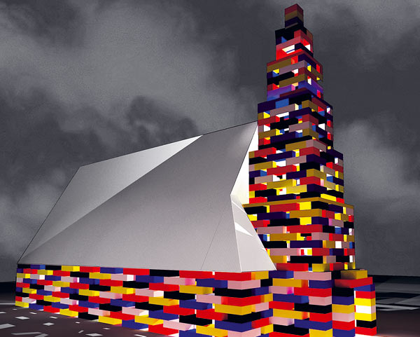 Op het Stationsplein in Enschede verrijst over enkele weken een tijdelijke 'Lego-kerk' van koud gestapelde betonblokken.