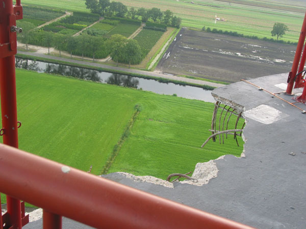 Het herstel van het betonnen gedeelte van de zendtoren bij Smilde is eigenlijk heel eenvoudig. De schade aan het gebouw en de gebouwgebonden installaties valt mee.