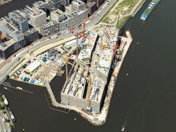 Drie aannemers bouwen op het kunstmatige schiereiland IJ-dock in Amsterdam onder de directie van ASR Vastgoed Ontwikkeling. Het bouwvolume bestaat uit vijf blokken, gescheiden door drie straten en voorzien van open doorzichten.