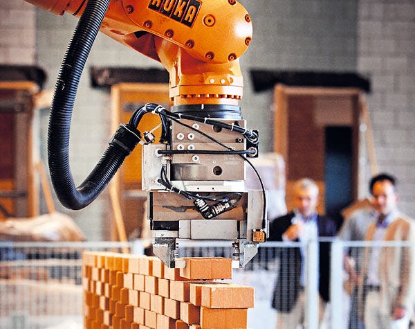 Een metselaar kan op het oog en met de hand afwijkingen corrigeren. Maar robot R-O-B kan bakstenen stapelen en verlijmen met vooraf vastgestelde nauwkeurige afwijkingen.