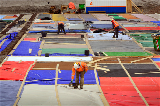 Bij de uitvoering van een aquaduct in Diemen - door SAAone (een combinatie van de bouwbedrijven Hochtief, VolkerWessels en Boskalis en de investeringsmaatschappij DIF) in opdracht van Rijkswaterstaat - wordt het beton beschermd tegen uitdroging door kunststof folie.