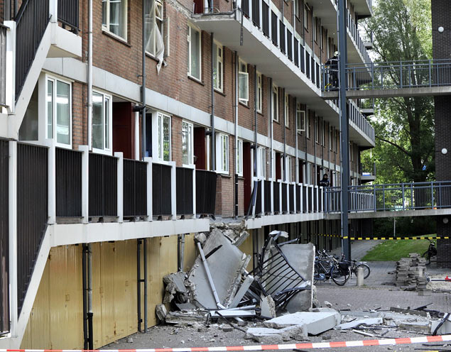 Aan de Antillenweg in Leeuwarden is een stuk uit de bovenste galerij van een flatgebouw losgeraakt. In zijn val heeft het delen van de vier galerijen eronder meegenomen. Het gaat om een type flats dat veel in Nederland is gebouwd.