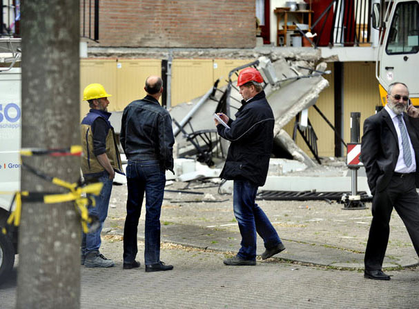 Ingenieursbureau Nebest voert destructief onderzoek uit aan de betonnen galerijen van de Antillenflat in Leeuwarden. Inmiddels heeft Friso Bouw stempels tussen de galerijen geplaatst, als veiligheidsmaatregel.