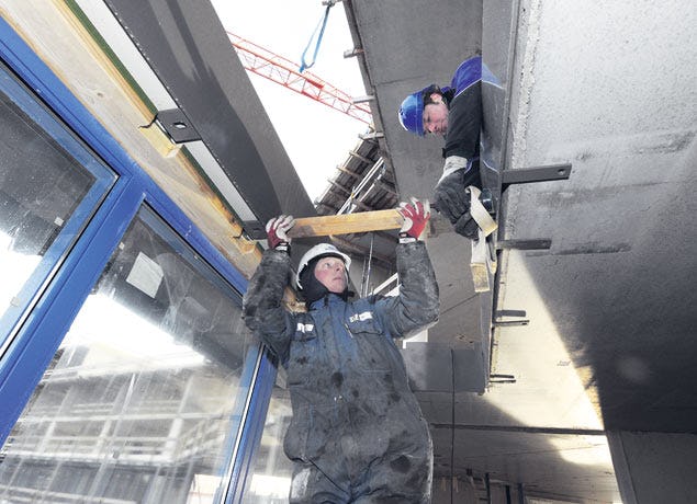 Haarlem Medewerkers van bouwbedrijf J. M. Deurwaarder uit Warmenhuizen monteren de stalen randafwerking van een trapgat aan een vloer van een bouwproject in Haarlem.
