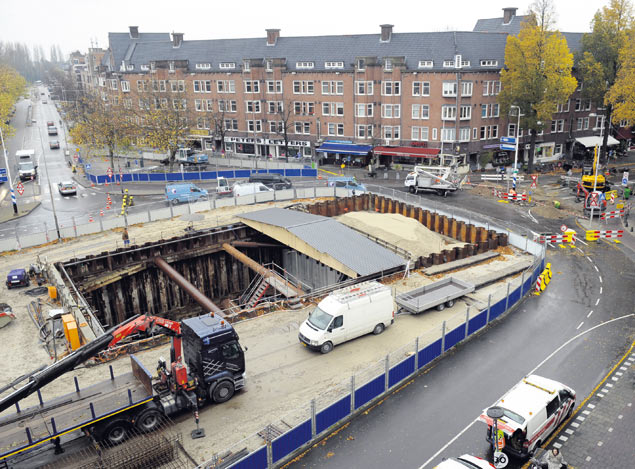Door het uitgraven van de verlengde bouwput van de NoordZuidlijn bij het Scheldeplein in Amsterdam is de grond enkele millimeters vervormd en daardoor is een hoofdriool verschoven.